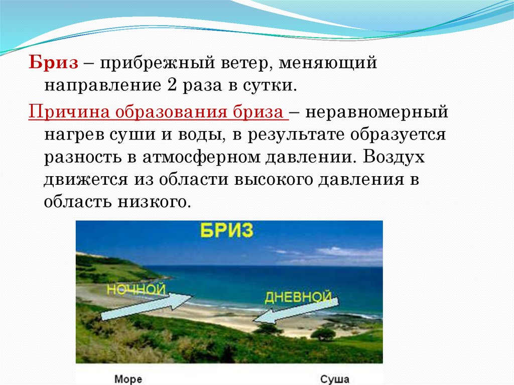 Бриз – прибрежный ветер, меняющийнаправление 2 раза в сутки.