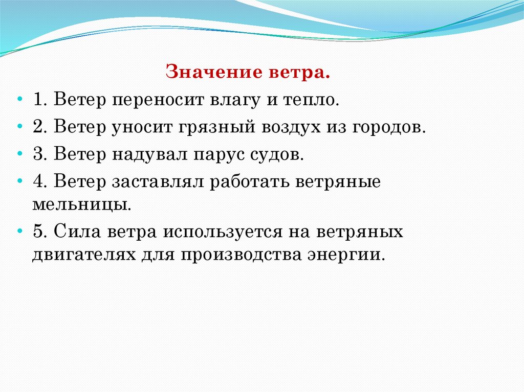 Значение ветра.• 1. Ветер переносит влагу и тепло.