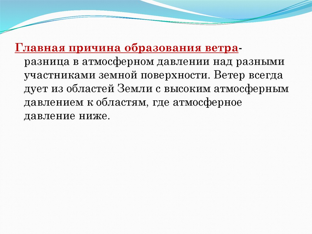 Главная причина образования ветраразница в атмосферном давлении над разнымиучастниками земной поверхности. Ветер всегда