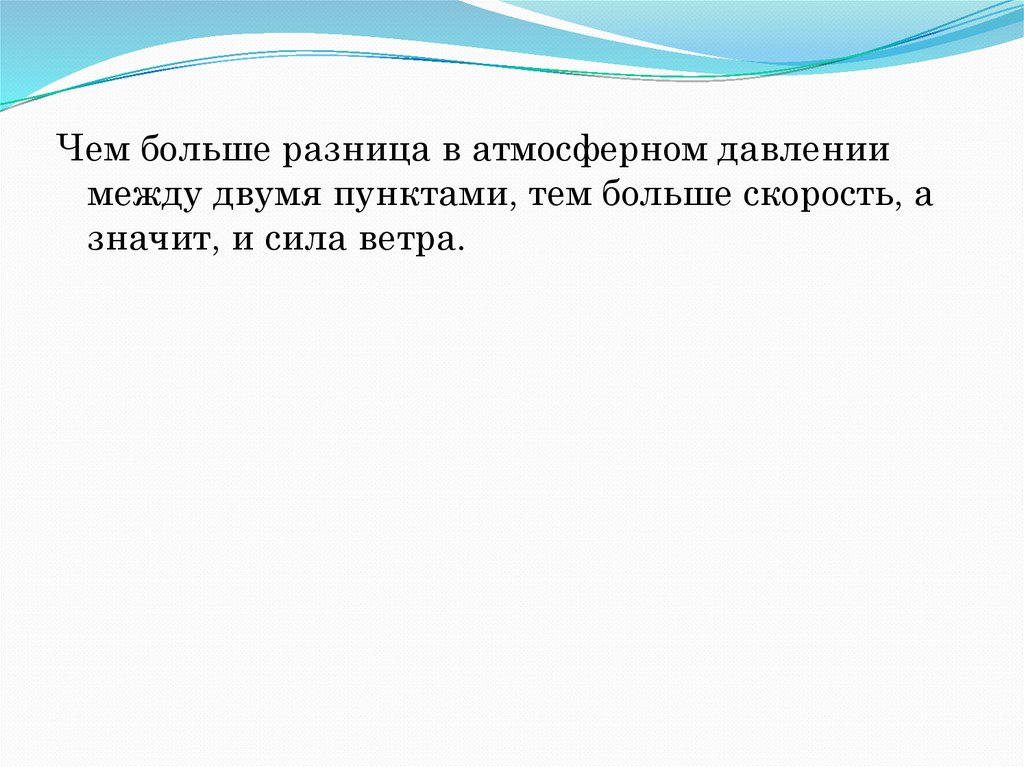 Чем больше разница в атмосферном давлениимежду двумя пунктами, тем больше скорость, а