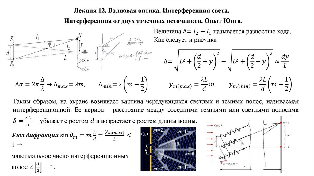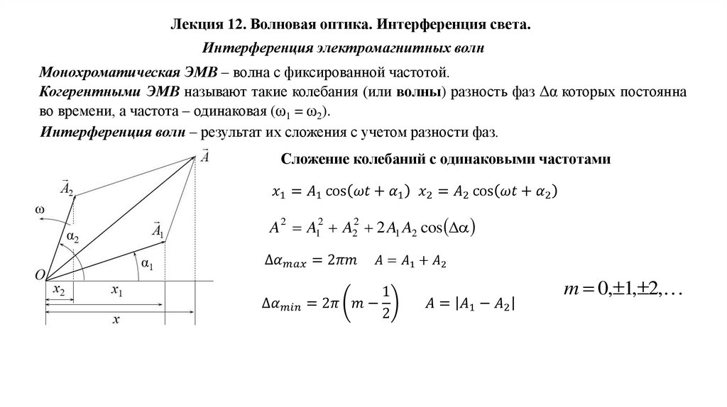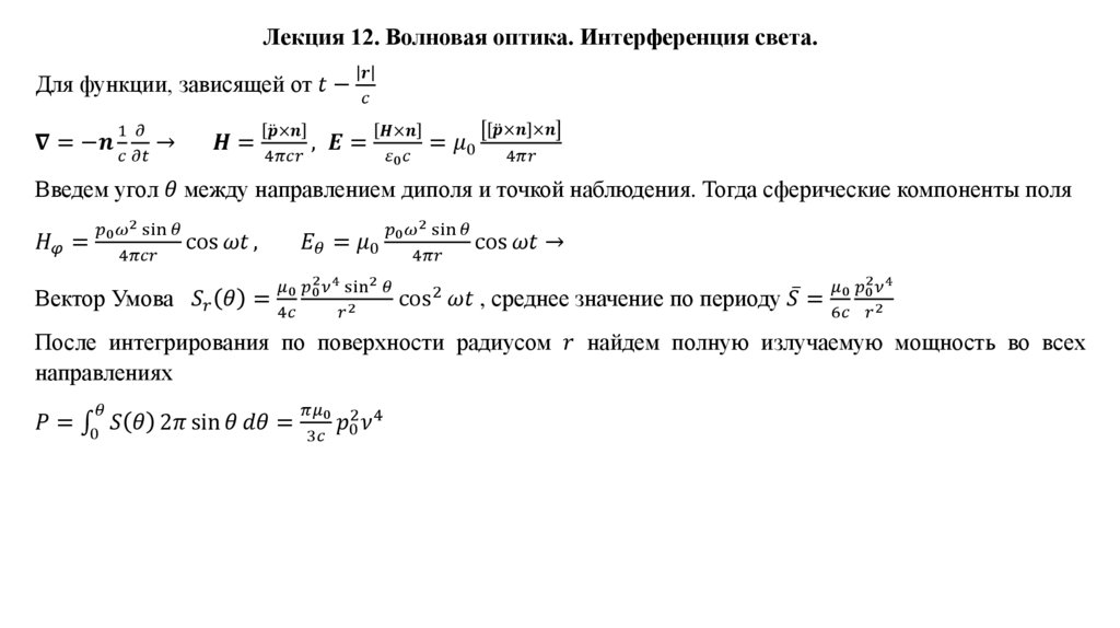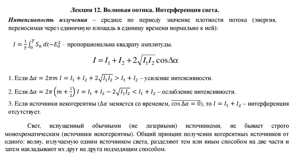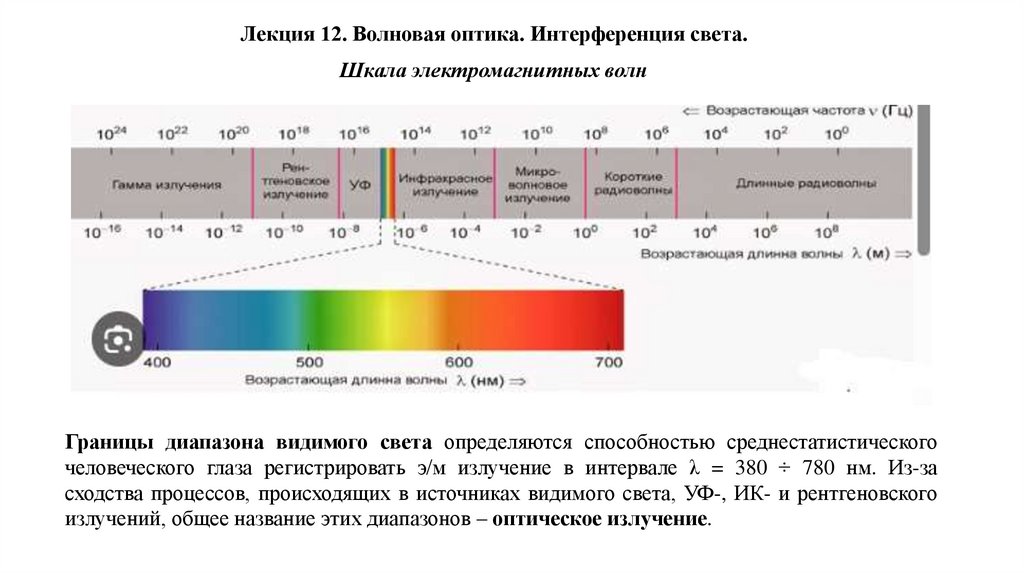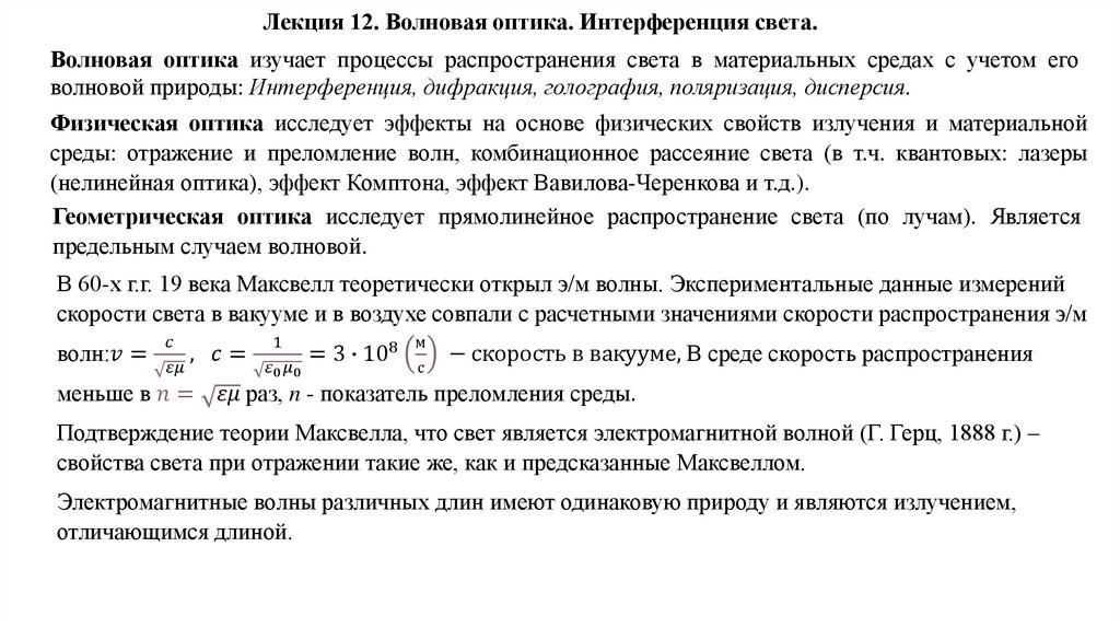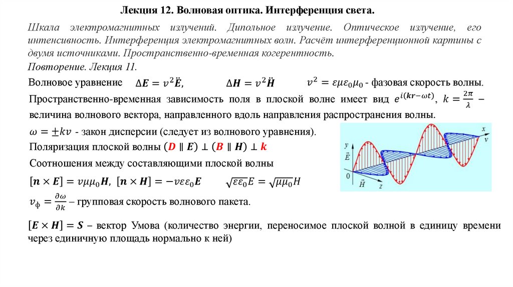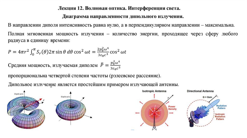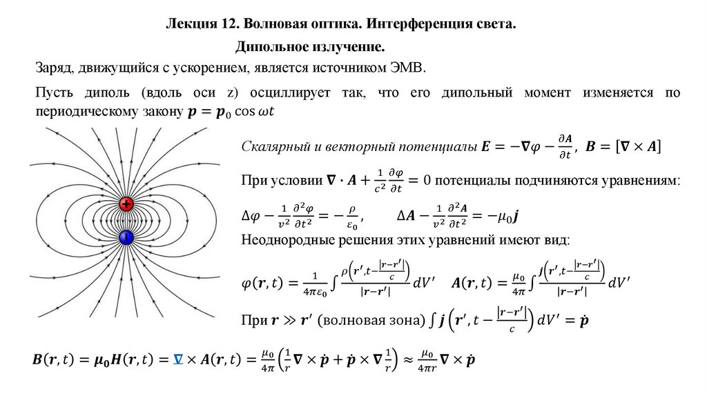 Лекция 12. Волновая оптика. Интерференция света.Шкала электромагнитных излучений. Дипольное излучение. Оптическое излучение, его