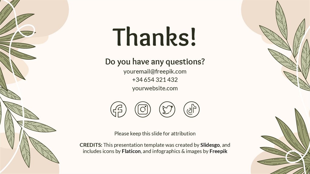 Hide or delete the “Thanks” slide and the mention to Slidesgo in the credits.