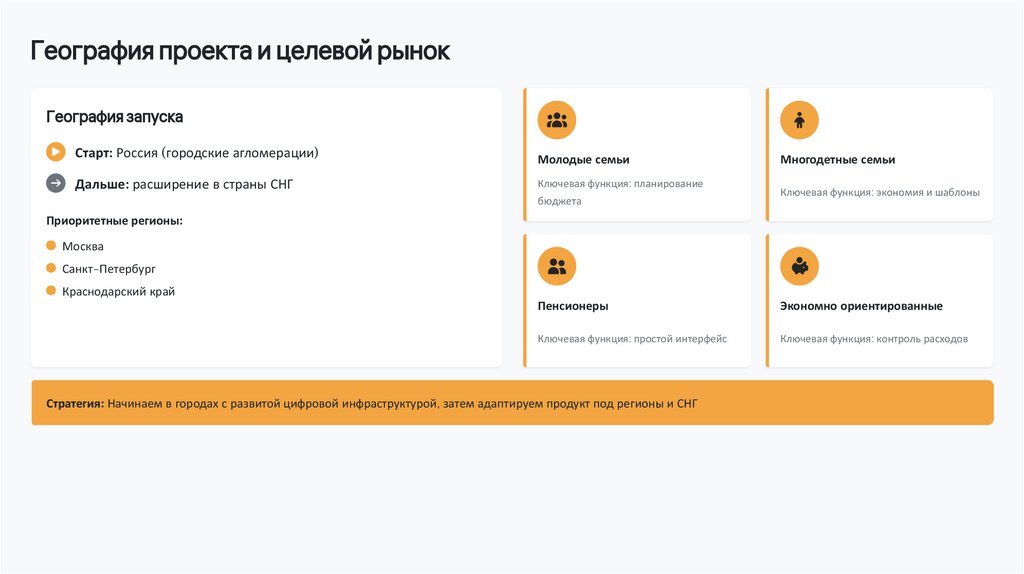 Стратегия: Начинаем в городах с развитой цифровой инфраструктурой, затем адаптируем продукт под регионы и СНГ