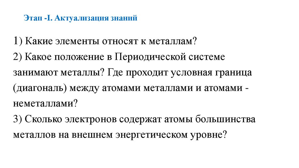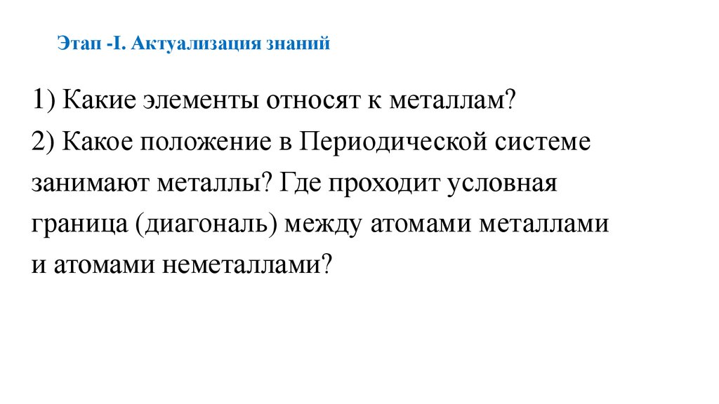 Этап -I. Актуализация знаний1) Какие элементы относят к металлам?