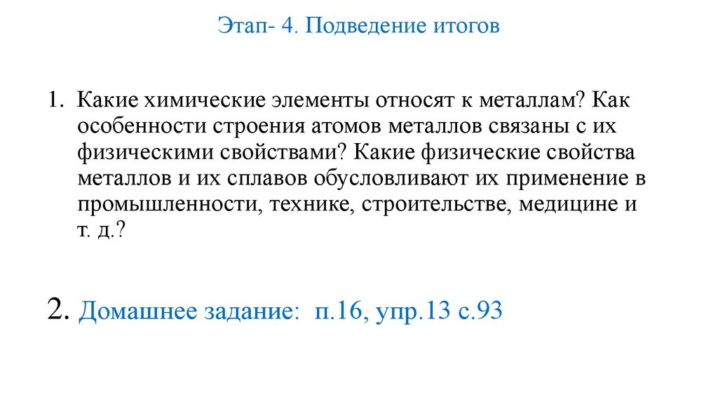 Этап- 4. Подведение итогов1. Какие химические элементы относят к металлам? Как