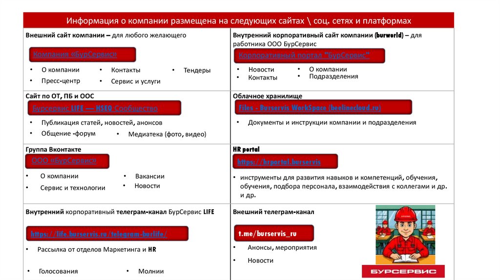 Информация о компании размещена на следующих сайтах \ соц. сетях и платформахВнешний сайт компании – для любого желающего