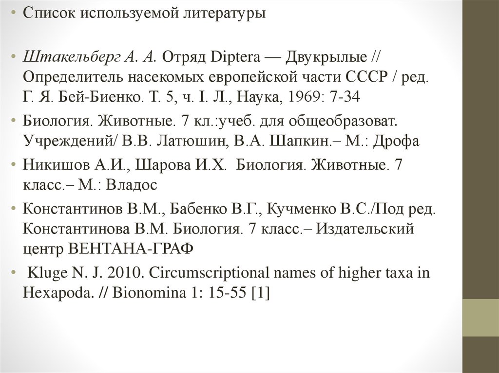 • Список используемой литературы• Штакельберг А. А. Отряд Diptera — Двукрылые //