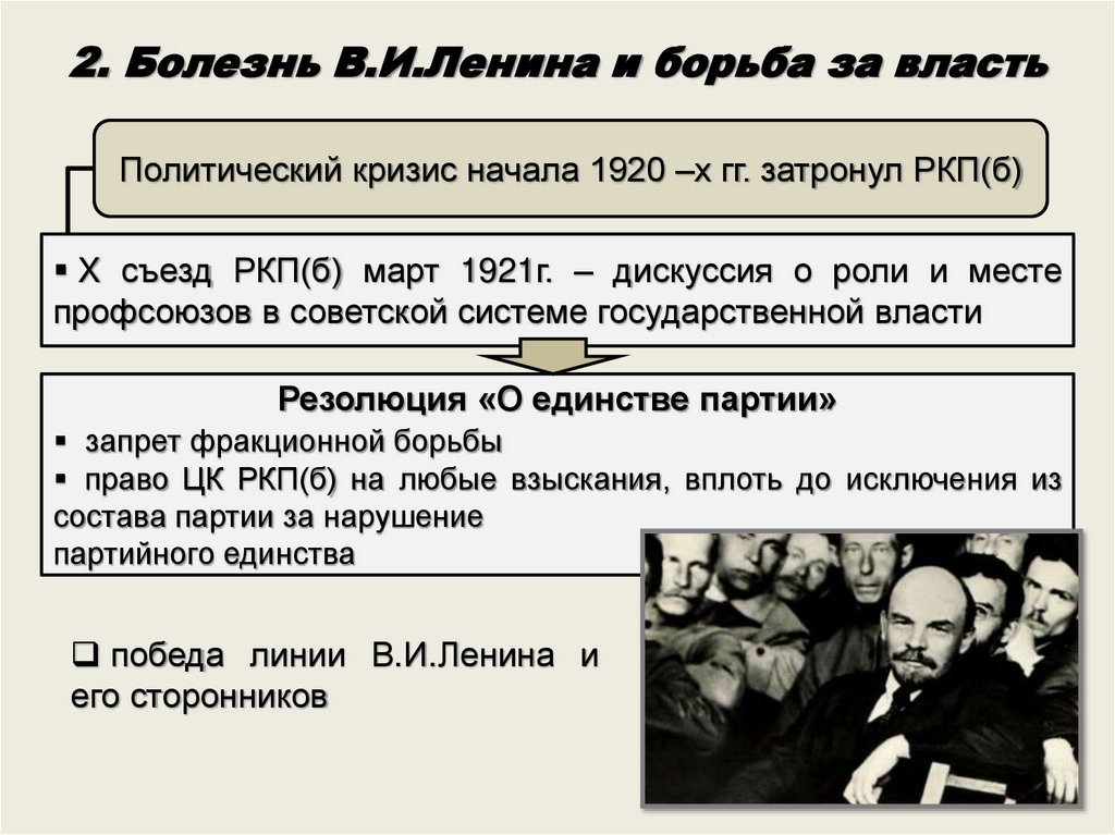 2. Болезнь В.И.Ленина и борьба за властьПолитический кризис начала 1920 –х гг. затронул РКП(б)