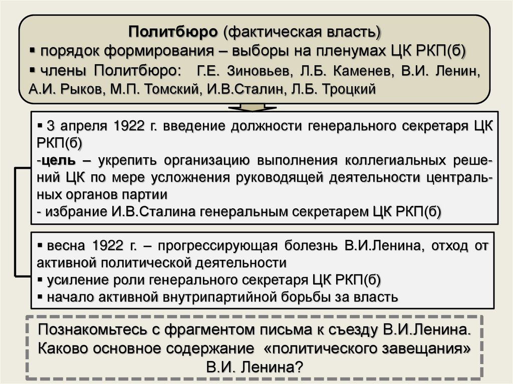 Политбюро (фактическая власть)порядок формирования – выборы на пленумах ЦК РКП(б)