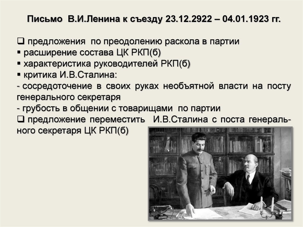 Письмо В.И.Ленина к съезду 23.12.2922 – 04.01.1923 гг.предложения по преодолению раскола в партии