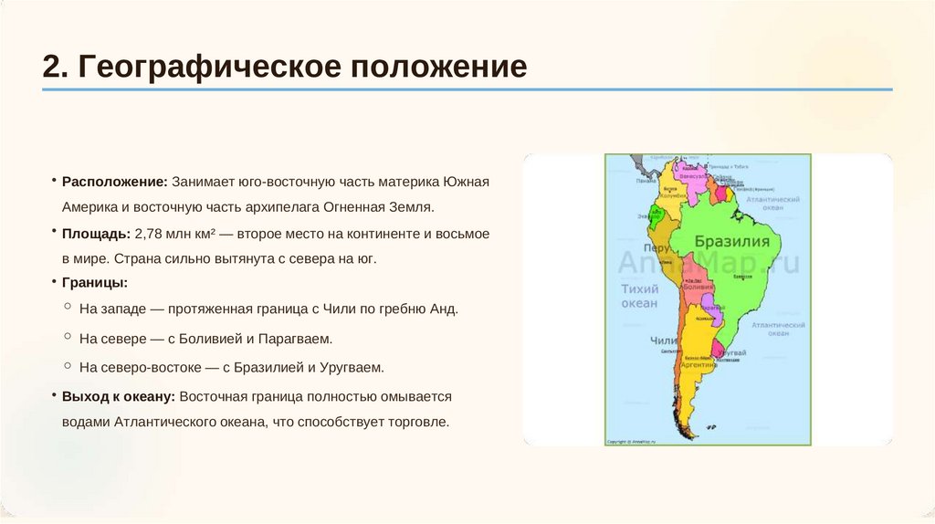 2. Географическое положение• Расположение: Занимает юго-восточную часть материка Южная