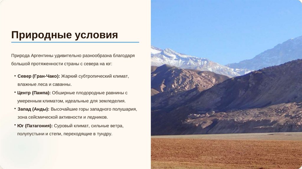 Природные условияПрирода Аргентины удивительно разнообразна благодаря