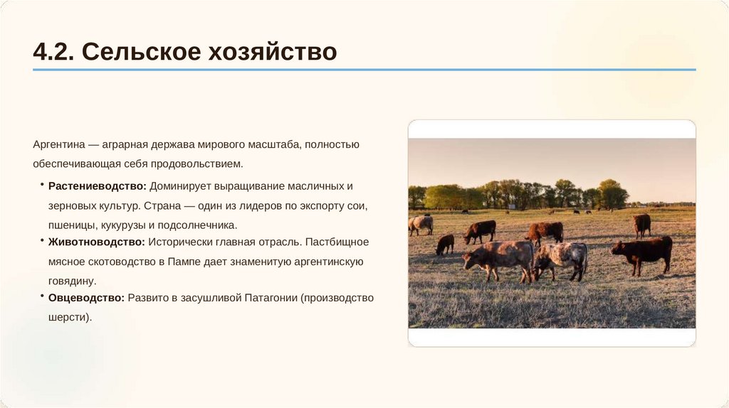 4.2. Сельское хозяйствоАргентина — аграрная держава мирового масштаба, полностью