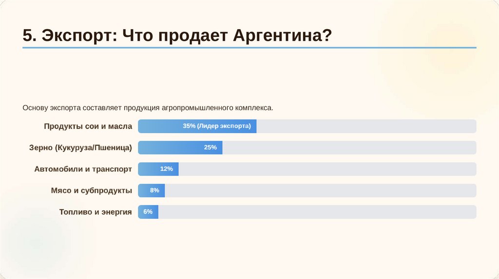 5. Экспорт: Что продает Аргентина?Основу экспорта составляет продукция агропромышленного комплекса.