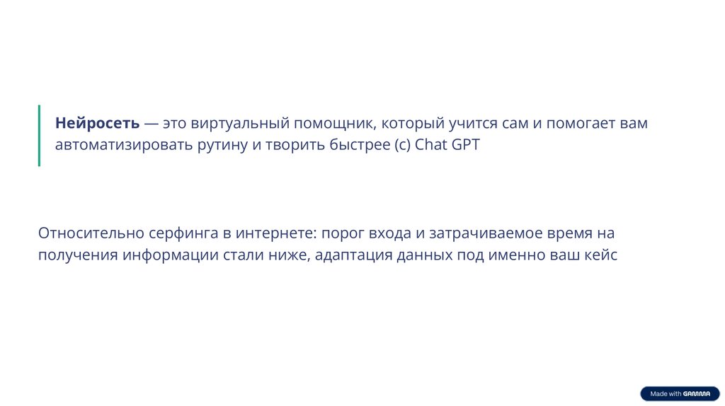 Нейросеть — это виртуальный помощник, который учится сам и помогает вамавтоматизировать рутину и творить быстрее (с) Chat GPT