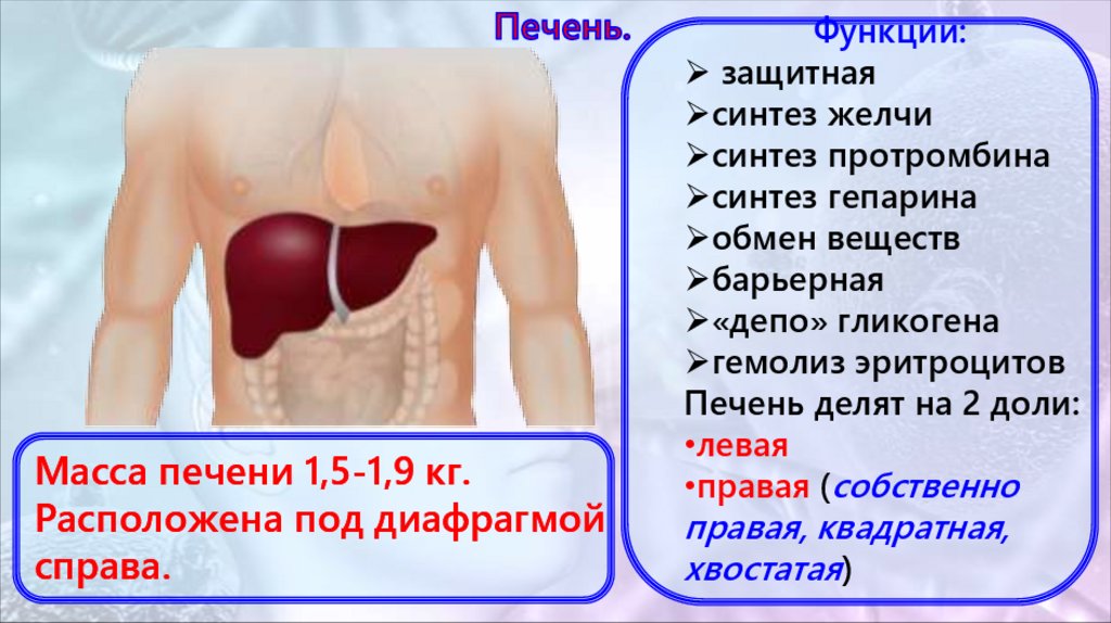 Масса печени 1,5-1,9 кг.Расположена под диафрагмой