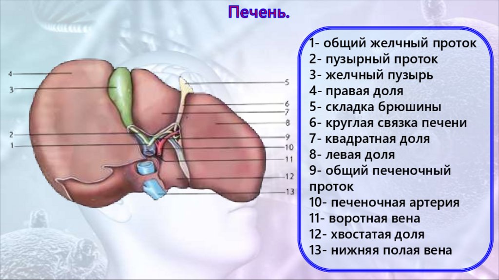 Печень делят на 2 доли: