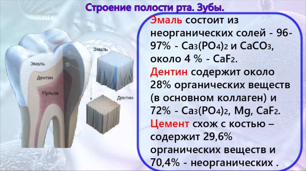 Эмаль состоит изнеорганических солей - 9697% - Са3(РО4)2 и СаСО3,