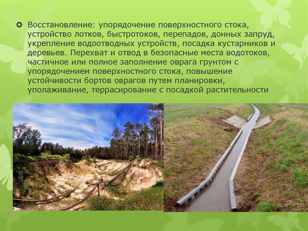 Восстановление: упорядочение поверхностного стока,устройство лотков, быстротоков, перепадов, донных запруд,