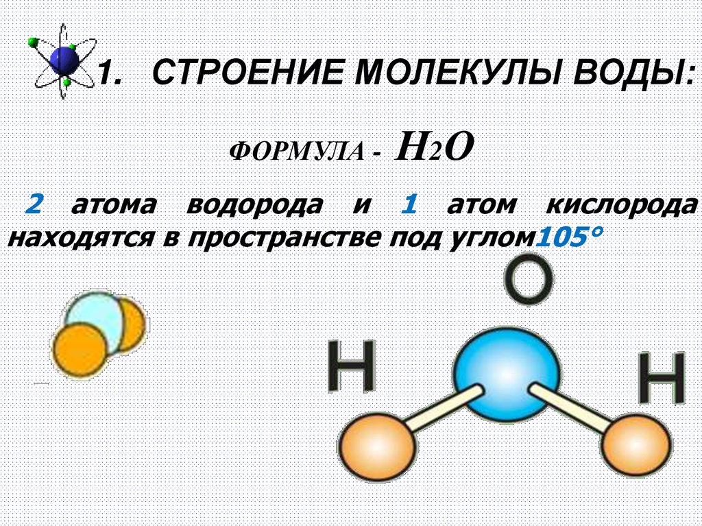 1. СТРОЕНИЕ МОЛЕКУЛЫ ВОДЫ:ФОРМУЛА - Н2О