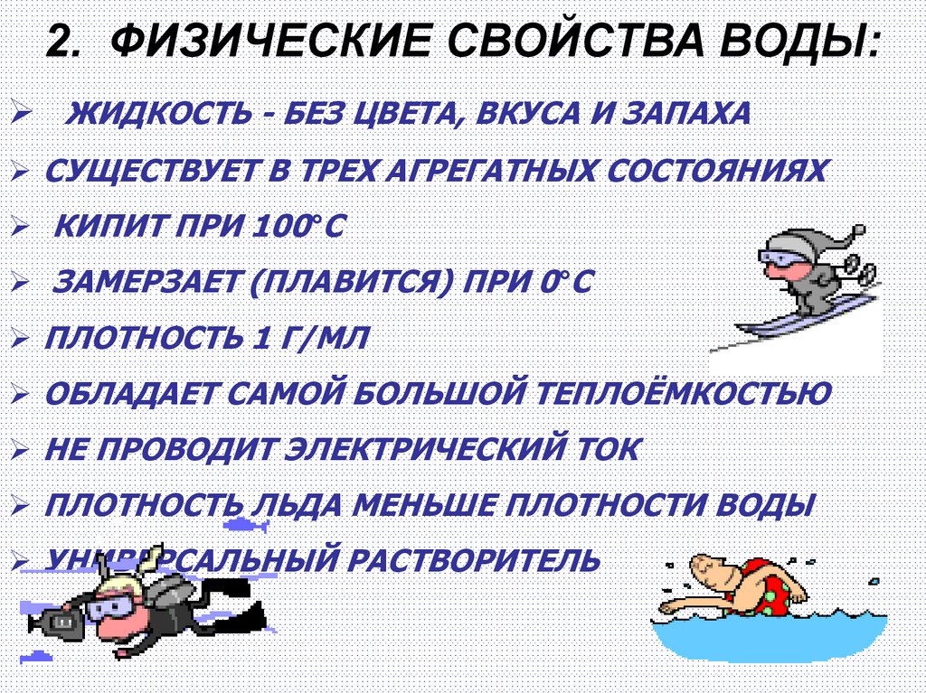 2. ФИЗИЧЕСКИЕ СВОЙСТВА ВОДЫ:ЖИДКОСТЬ - БЕЗ ЦВЕТА, ВКУСА И ЗАПАХА