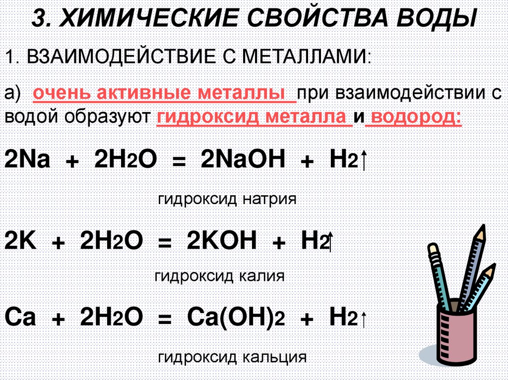 3. ХИМИЧЕСКИЕ СВОЙСТВА ВОДЫ1. ВЗАИМОДЕЙСТВИЕ С МЕТАЛЛАМИ: