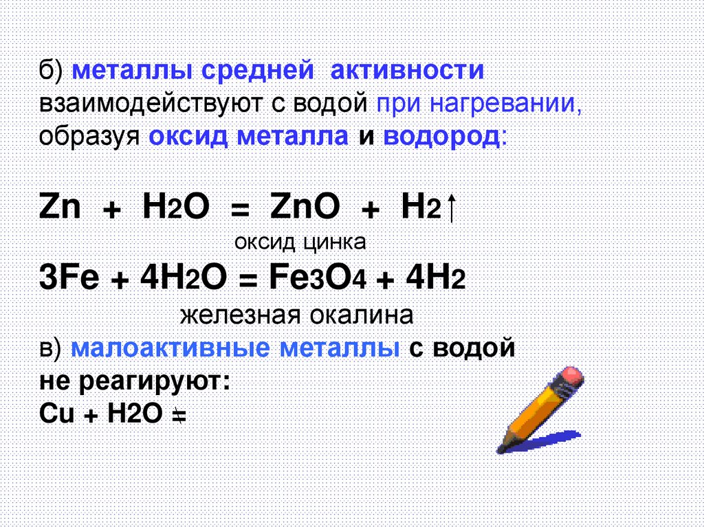 б) металлы средней активностивзаимодействуют с водой при нагревании,
