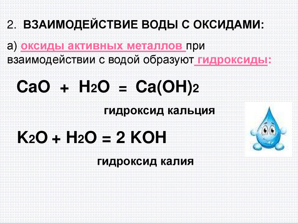 2. ВЗАИМОДЕЙСТВИЕ ВОДЫ С ОКСИДАМИ:а) оксиды активных металлов при