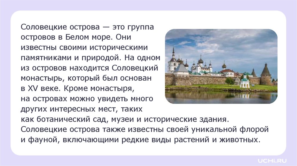 Соловецкие острова — это группаостровов в Белом море. Они