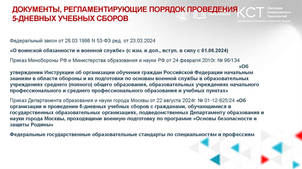 ДОКУМЕНТЫ, РЕГЛАМЕНТИРУЮЩИЕ ПОРЯДОК ПРОВЕДЕНИЯ5-ДНЕВНЫХ УЧЕБНЫХ СБОРОВ