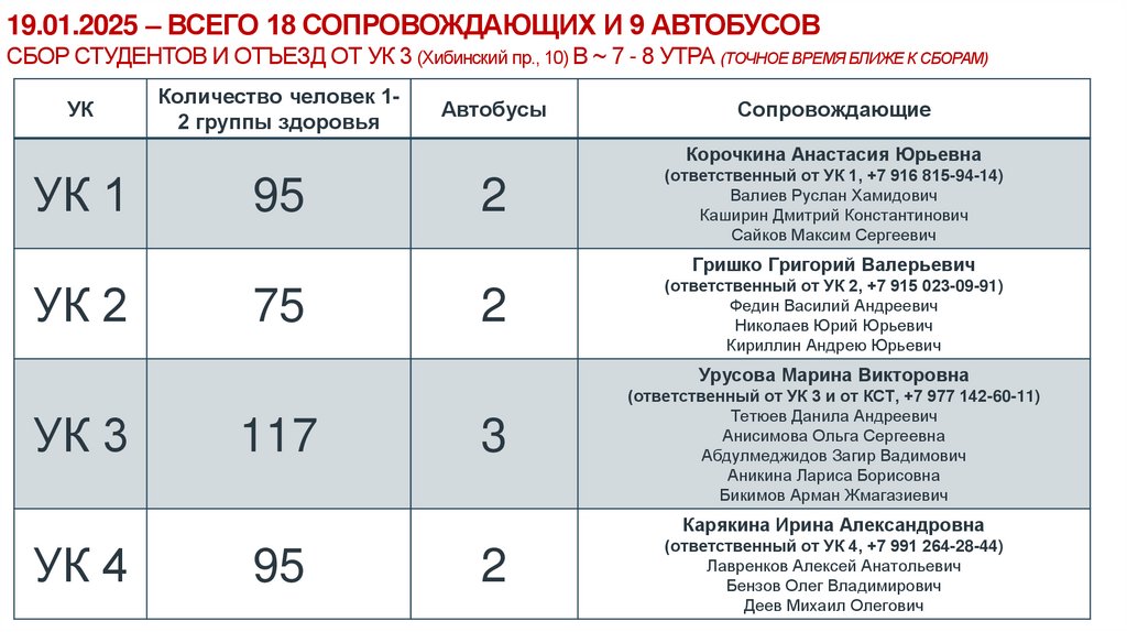 19.01.2025 – ВСЕГО 18 СОПРОВОЖДАЮЩИХ И 9 АВТОБУСОВСБОР СТУДЕНТОВ И ОТЪЕЗД ОТ УК 3 (Хибинский пр., 10) В ~ 7 - 8 УТРА (ТОЧНОЕ ВРЕМЯ БЛИЖЕ К СБОРАМ)