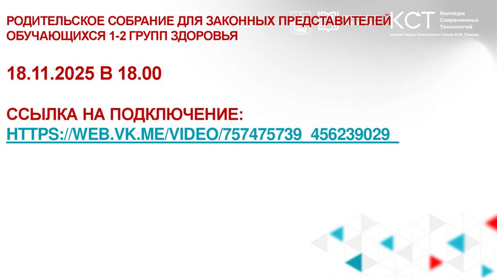 РОДИТЕЛЬСКОЕ СОБРАНИЕ ДЛЯ ЗАКОННЫХ ПРЕДСТАВИТЕЛЕЙОБУЧАЮЩИХСЯ 1-2 ГРУПП ЗДОРОВЬЯ