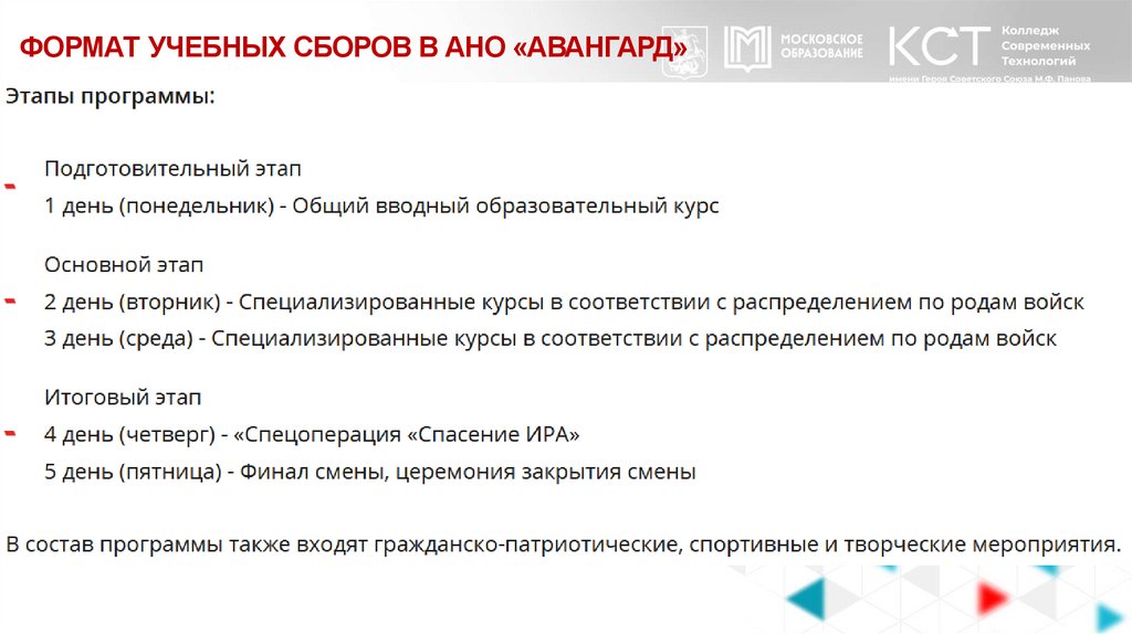 ФОРМАТ УЧЕБНЫХ СБОРОВ В АНО «АВАНГАРД»5.