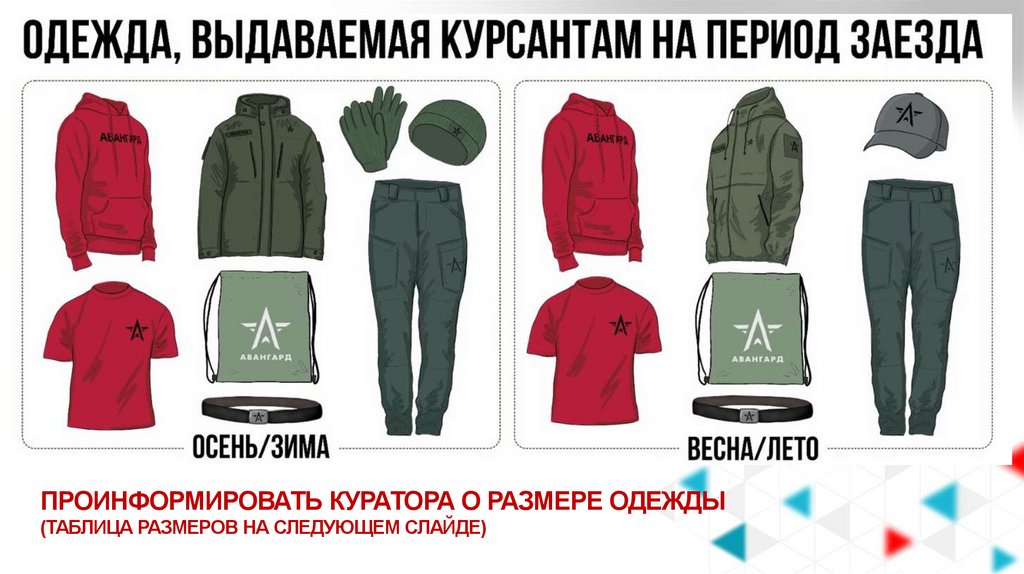 ПРОИНФОРМИРОВАТЬ КУРАТОРА О РАЗМЕРЕ ОДЕЖДЫ(ТАБЛИЦА РАЗМЕРОВ НА СЛЕДУЮЩЕМ СЛАЙДЕ)