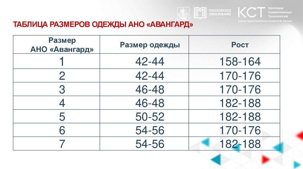 ТАБЛИЦА РАЗМЕРОВ ОДЕЖДЫ АНО «АВАНГАРД»Размер