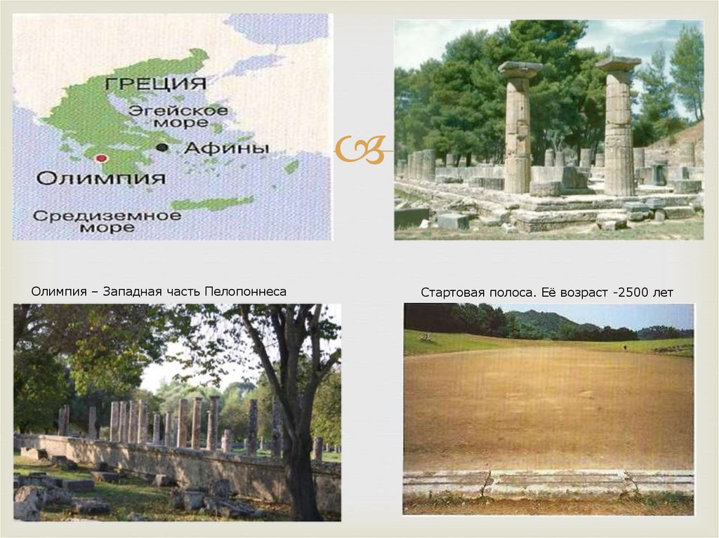 Олимпия – Западная часть ПелопоннесаСтартовая полоса. Её возраст -2500 лет