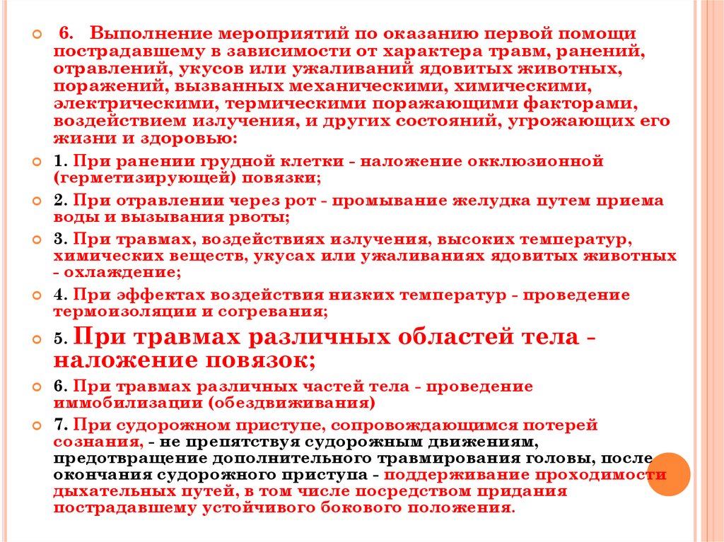 6. Выполнение мероприятий по оказанию первой помощипострадавшему в зависимости от характера травм, ранений,
