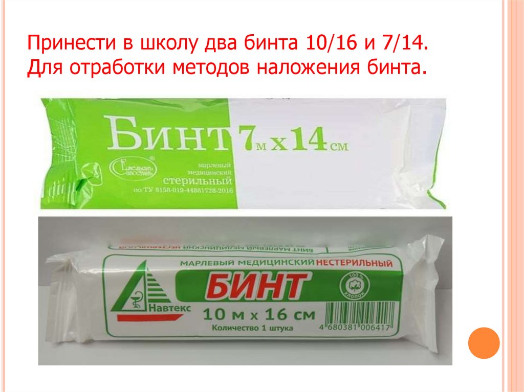 Принести в школу два бинта 10/16 и 7/14.Для отработки методов наложения бинта.