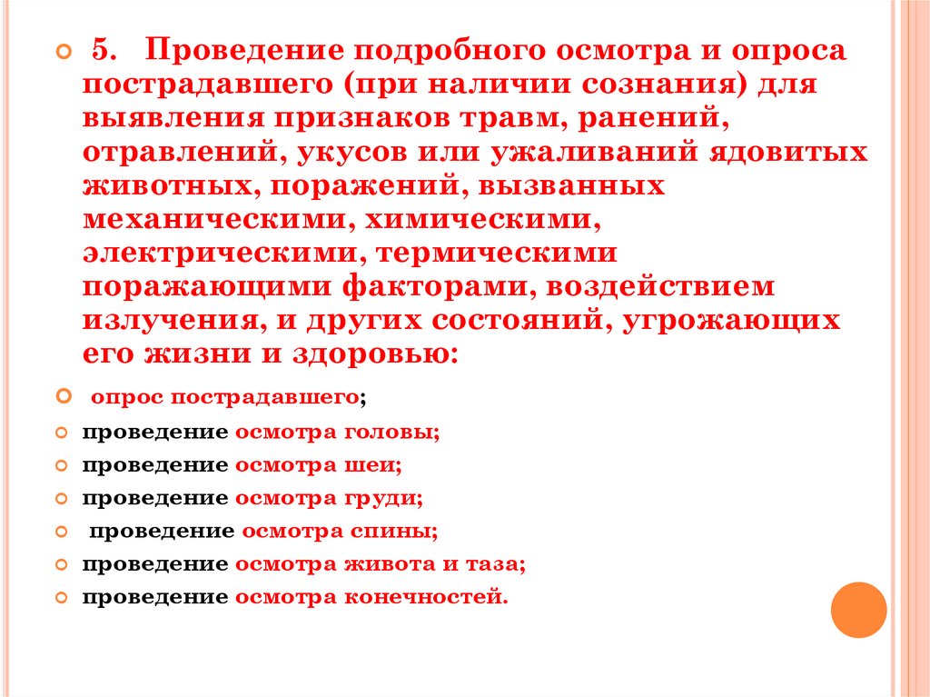 5. Проведение подробного осмотра и опросапострадавшего (при наличии сознания) для