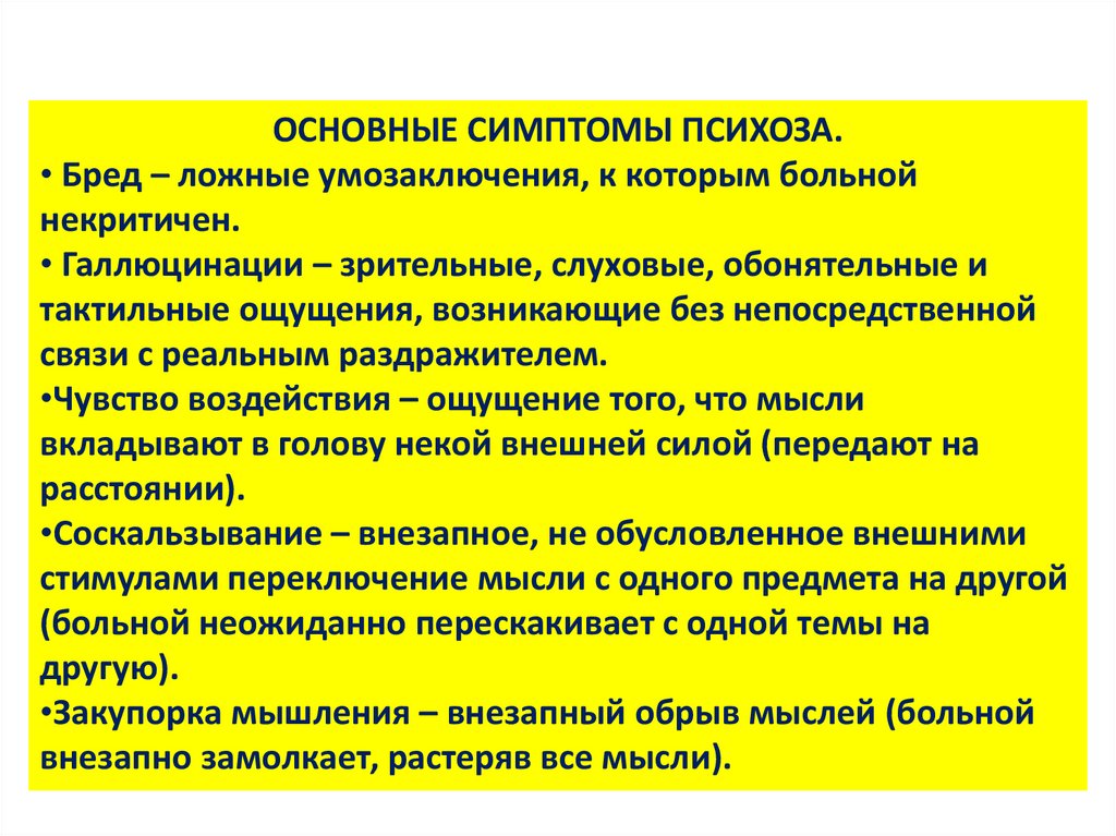 ОСНОВНЫЕ СИМПТОМЫ ПСИХОЗА.• Бред – ложные умозаключения, к которым больной