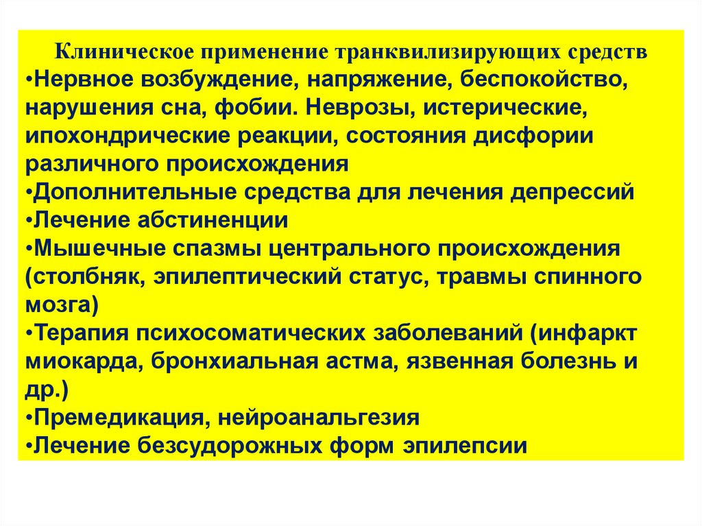Клиническое применение транквилизирующих средств•Нервное возбуждение, напряжение, беспокойство,