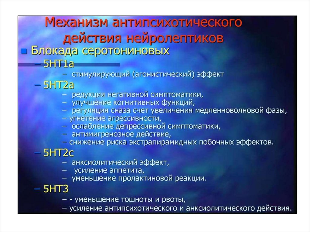 “занятость” 80-90 % серотониновых рецепторов 5-НТ2 типа в