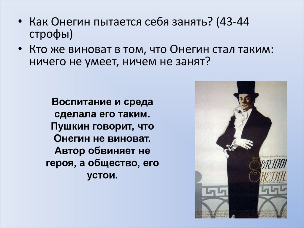 • Как Онегин пытается себя занять? (43-44строфы)