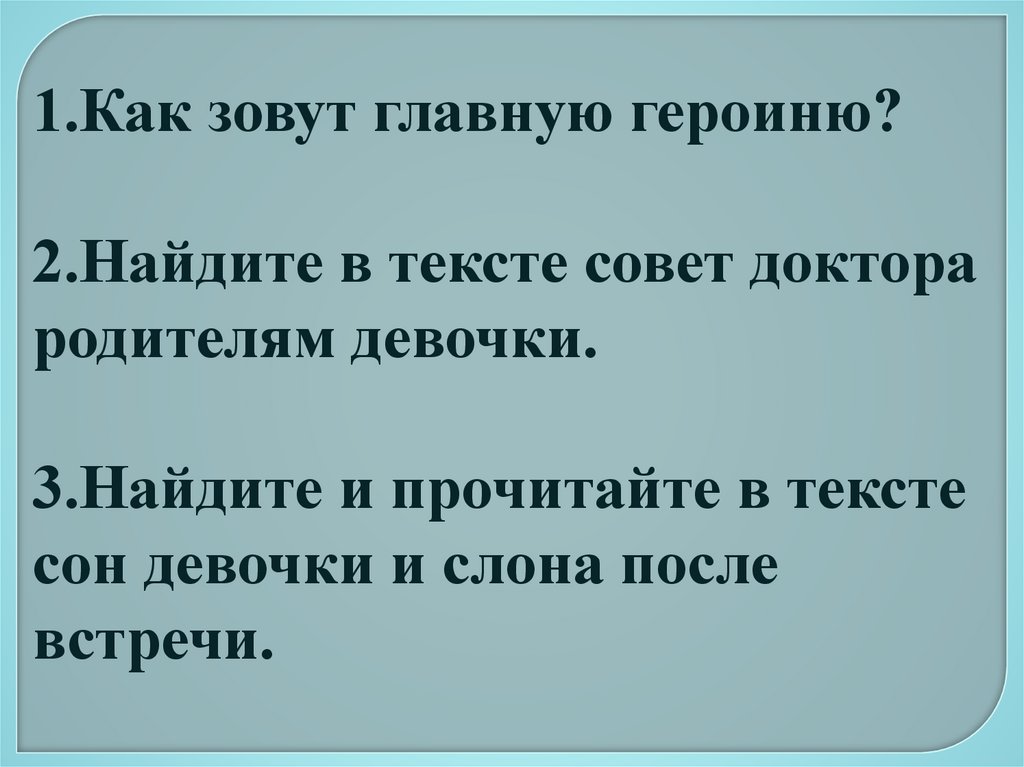 1.Как зовут главную героиню?2.Найдите в тексте совет доктора