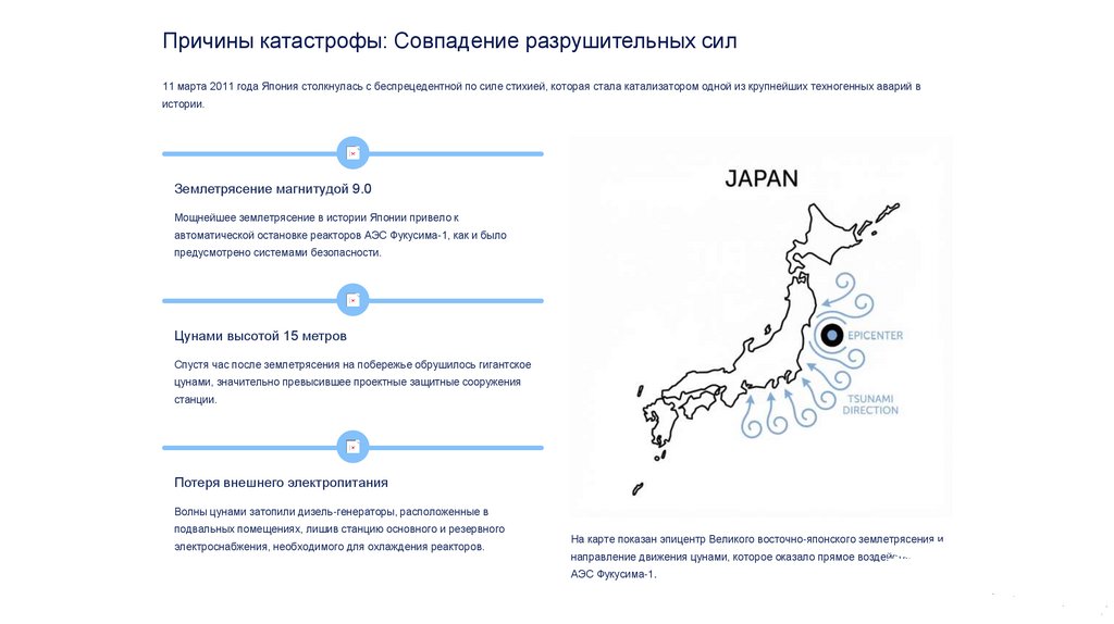 Причины катастрофы: Совпадение разрушительных сил11 марта 2011 года Япония столкнулась с беспрецедентной по силе стихией, которая стала катализатором одной из крупнейших техногенных аварий в