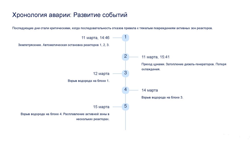 Хронология аварии: Развитие событийПоследующие дни стали критическими, когда последовательность отказов привела к тяжелым повреждениям активных зон реакторов.