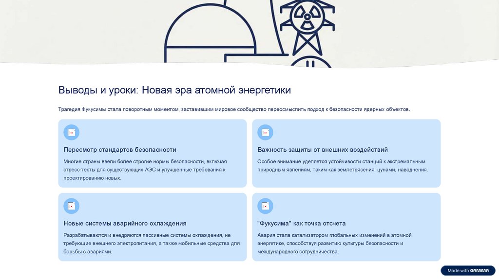 Выводы и уроки: Новая эра атомной энергетикиТрагедия Фукусимы стала поворотным моментом, заставившим мировое сообщество переосмыслить подход к безопасности ядерных объектов.