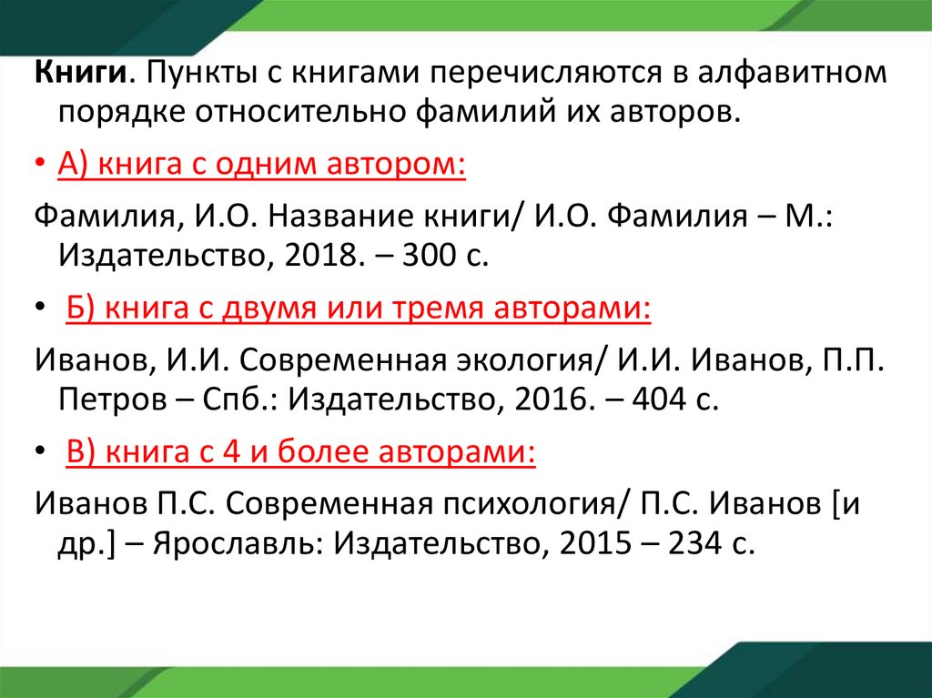 Книги. Пункты с книгами перечисляются в алфавитномпорядке относительно фамилий их авторов.