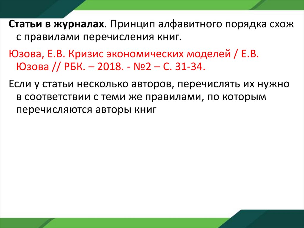 Статьи в журналах. Принцип алфавитного порядка схожс правилами перечисления книг.