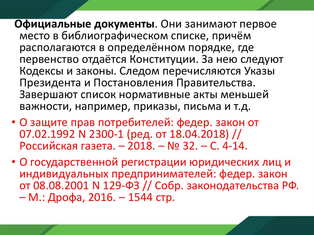 • Существует порядок указания источников в спискелитературы: сначала указывают официальные
